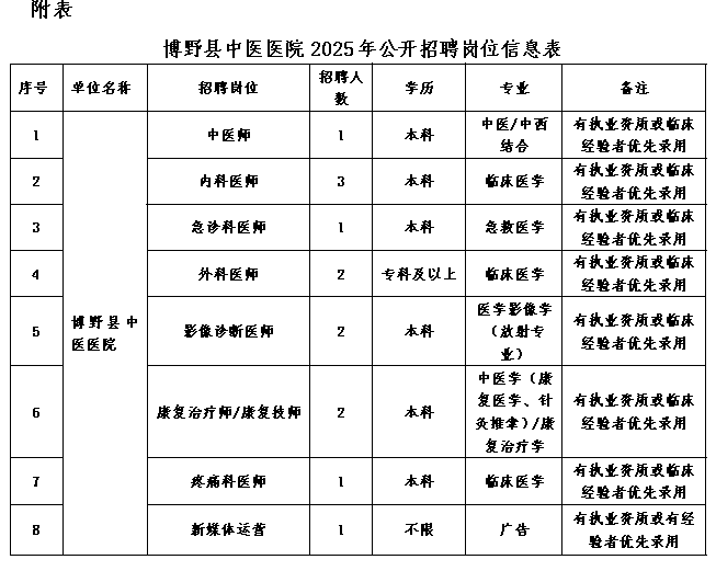 中医师(1人)、内科医师(3人)、急诊科医师(1人)、外科医师(2人)、影像诊断医师(2人)、康复治疗师/康复技师(2人)、疼痛科医师(1人)、新媒体运营(1人)。